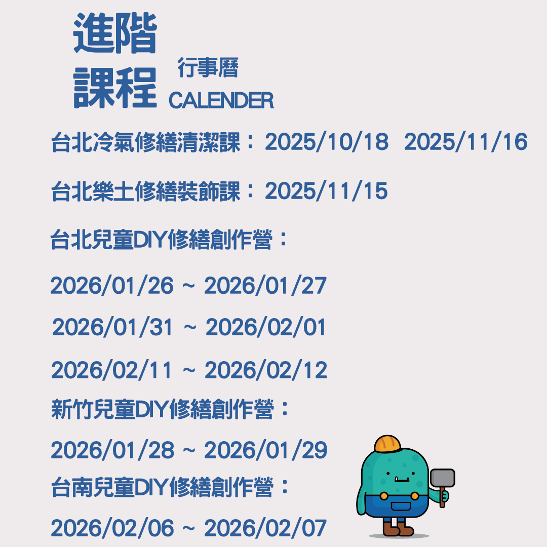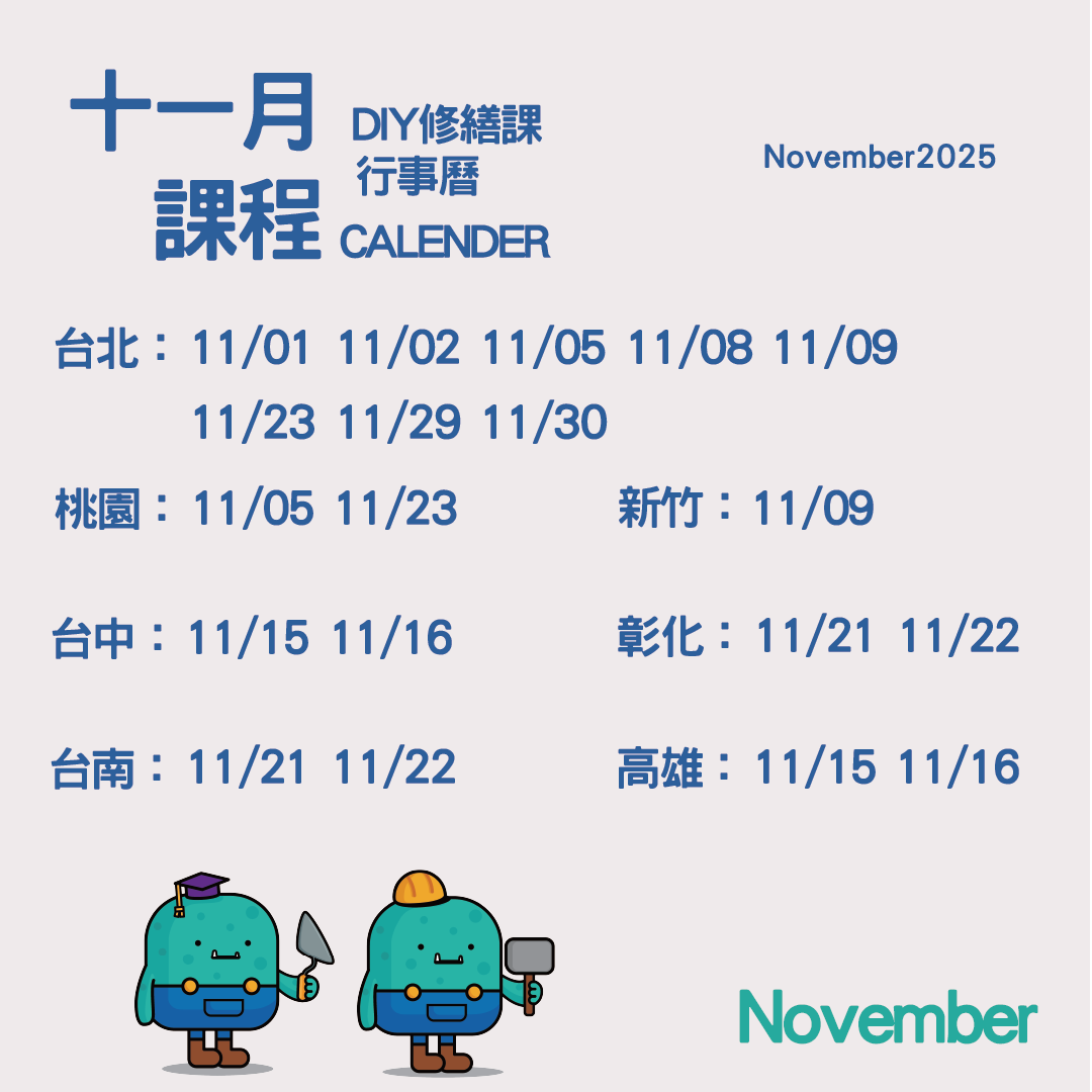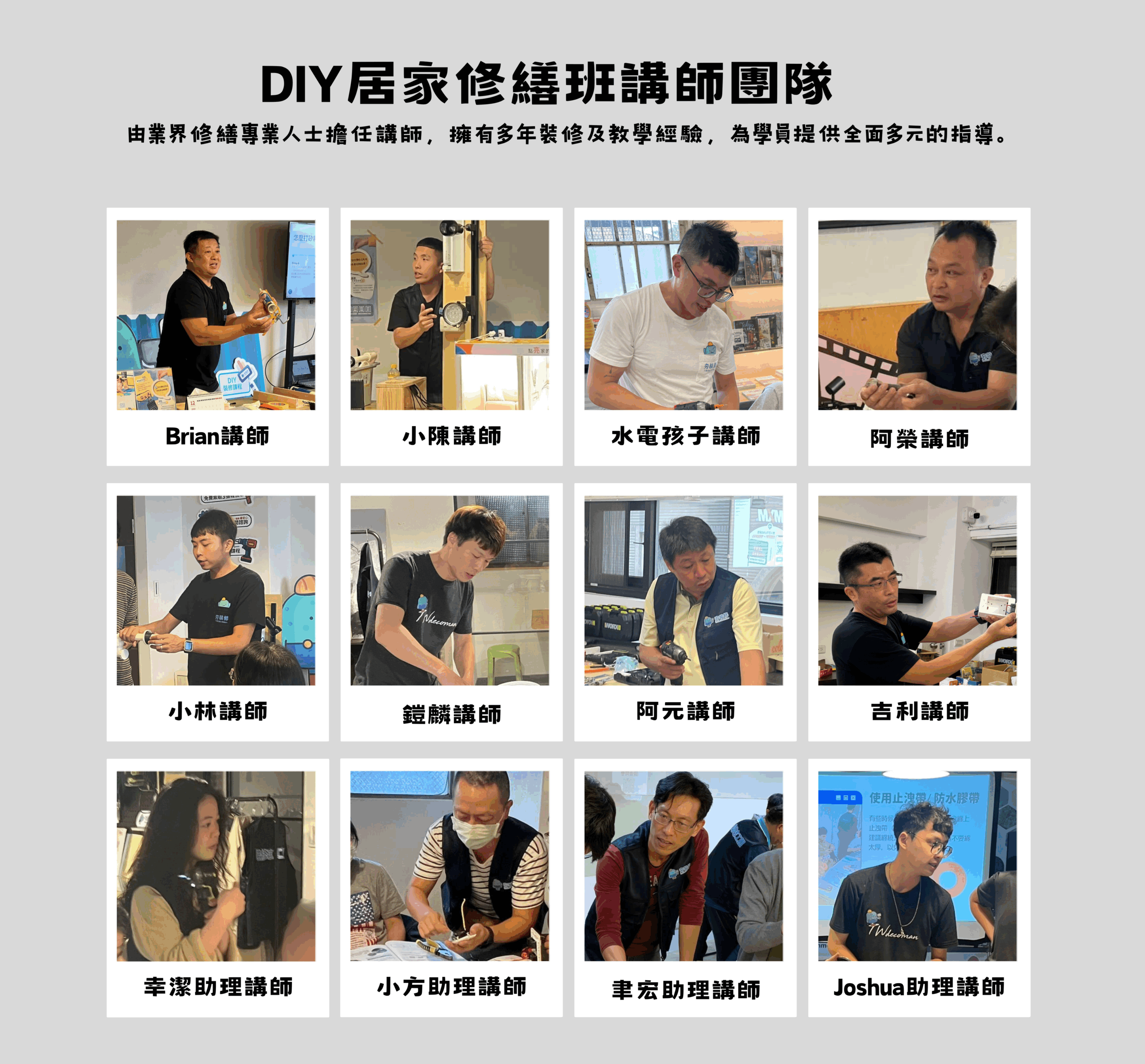 精選常見居家修繕項目,高比例實作,零基礎入門教學,只要你有興趣,無論是不是新手,男女老少都可參加。