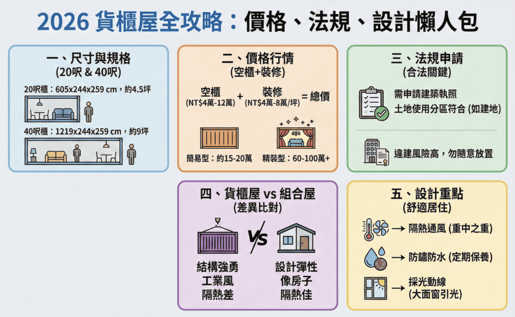 全新貨櫃: 結構最完整,無鏽蝕問題。20 呎新櫃約在 NT$ 100,000 上下。2. 裝修與改造成本
