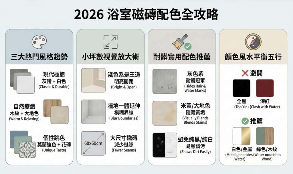 在決定顏色之前,許多人會問:「浴室適合什麼磁磚?」除了考量防滑係數(建議 R10 以上)與吸水率(選擇低吸水率的石英磚或瓷質磚)外,顏色的搭配直接決定了空間的靈魂。以下是今年最受歡迎的三種配色邏輯: