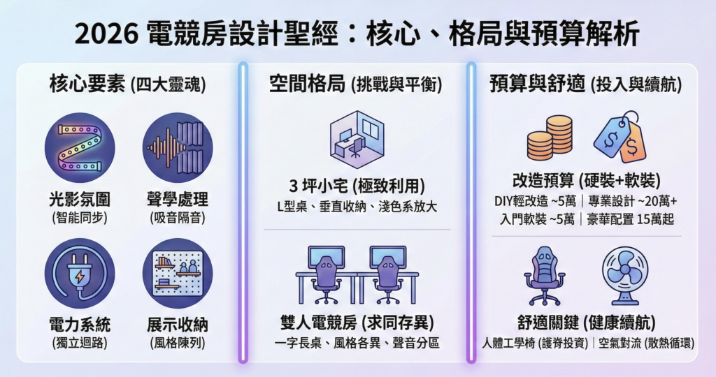 電競房間改造價格因需求而異,我們可以將預算分為「硬裝」與「軟裝設備」兩個部分來看(以下估價以 2026 年市場行情參考):