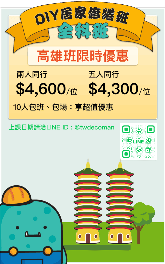 1. 【開課條件】DIY修繕班幾個人確定開班上課呢?基礎開班人數為8人,學院人員將於開課日前三天告知當期課程是否成功開課。若人數未達開班人數,將詢問學生是否同意調課,若不同意調課將扣除匯款手續費後退費。但若因個人不可抗拒之因素導致無法參加課程,請參照第五點退費標準。
