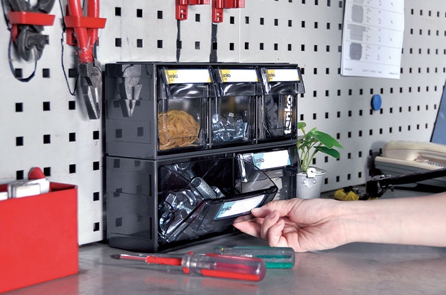 不只是孩子的收納,上手盒原本就是工業等級的零件收納盒,PC 材質耐衝擊、防油且耐用,因此小工具、螺絲、鑽頭、五金小料也能井然有序地安頓在其中。放在家庭工作角、書桌旁、玄關或興趣桌都毫不突兀,反而能讓空間更加整潔。