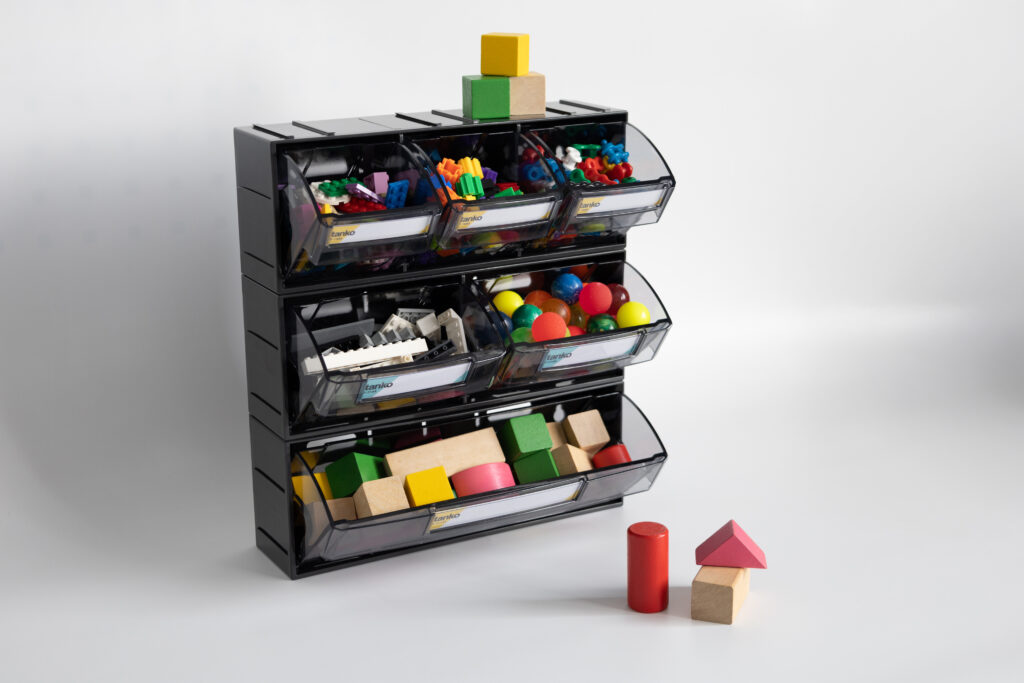 抽屜的 50 度斜開設計也相當貼心。開關滑順、不易卡住,小手也能輕鬆操作,不論是樂高零件、扭蛋小物或模型配件,都可以快速拿取並收回。抽屜打開後往上提即可取出,清潔沒死角,三種尺寸也能依需求自由互換。